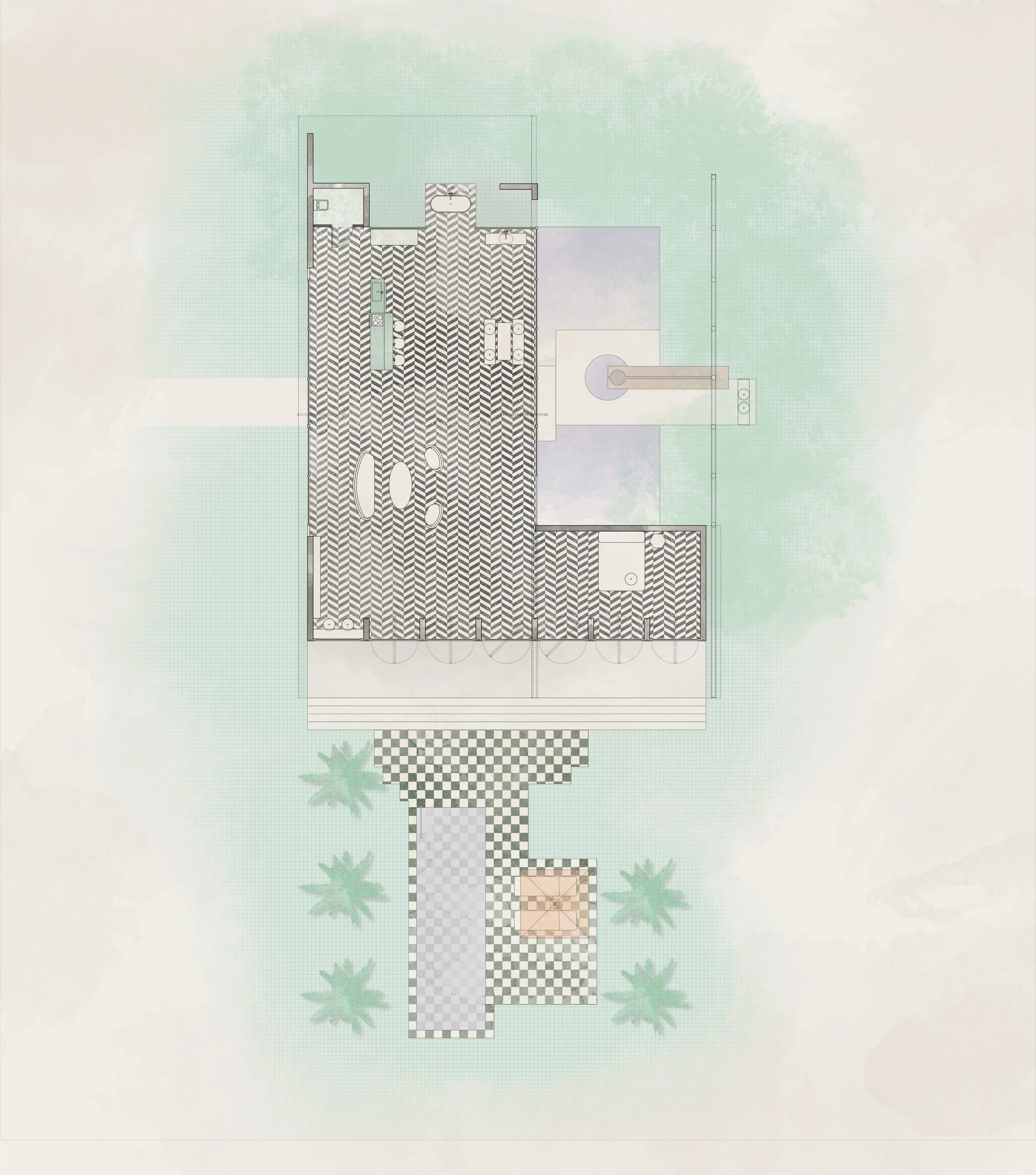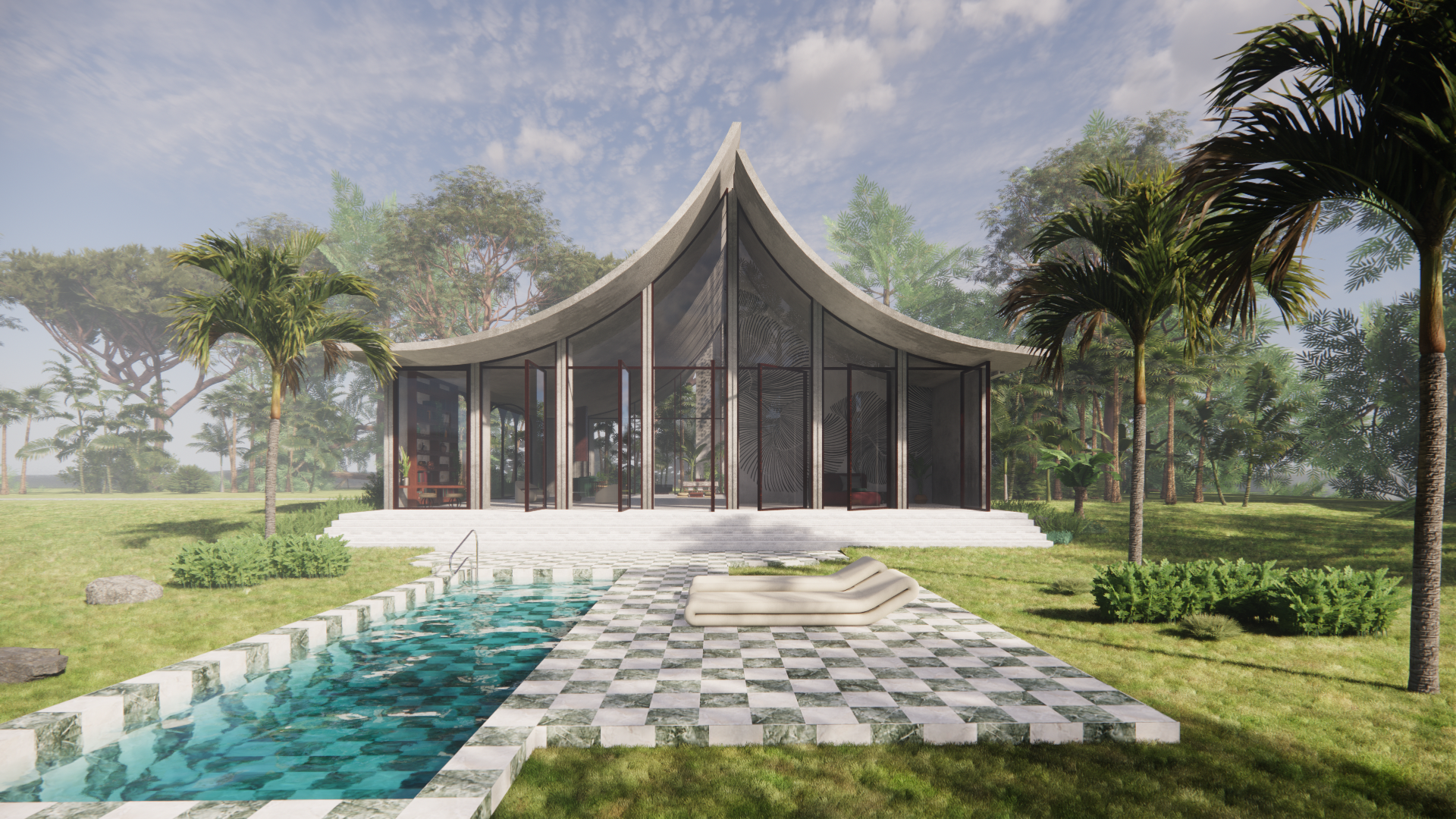 An open plan approach ensures flexibility and fluidity of movement with uses placed on a linear axis, further exaggerated by the swimming pool on the south. Privacy, where needed, is rarely achieved by the rigidness of walls. Instead, it is created by the translucency of fabric or the coverage of green leaves.