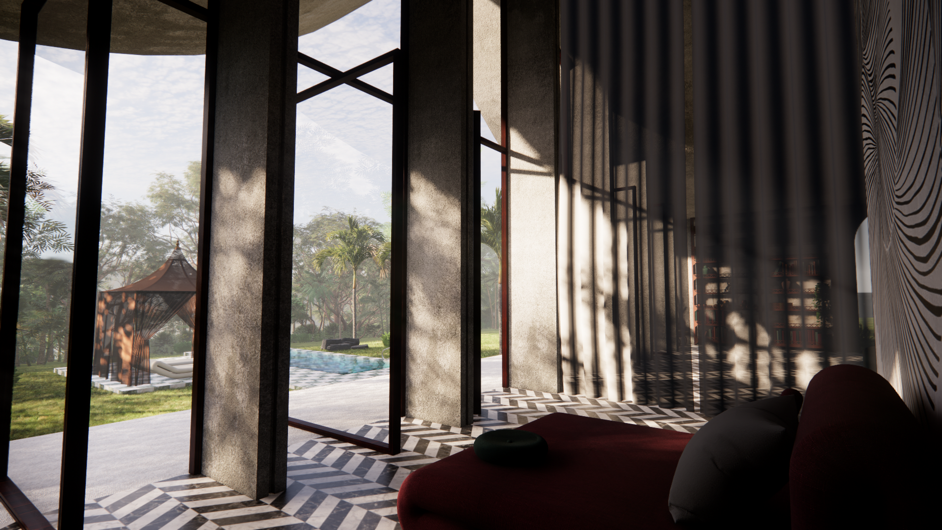In praise of light is a design for a competition for a small home that only relies on natural light and has no artificial light sources. A home at the edge of a tropical forest where light penetrates layers of fog. The plot is surrounded by trees and bushes that cast shadows on the structure. This design explores how natural light can be manipulated through geometry and a series of openings, perforations, reflections and translucencies of different materials.
