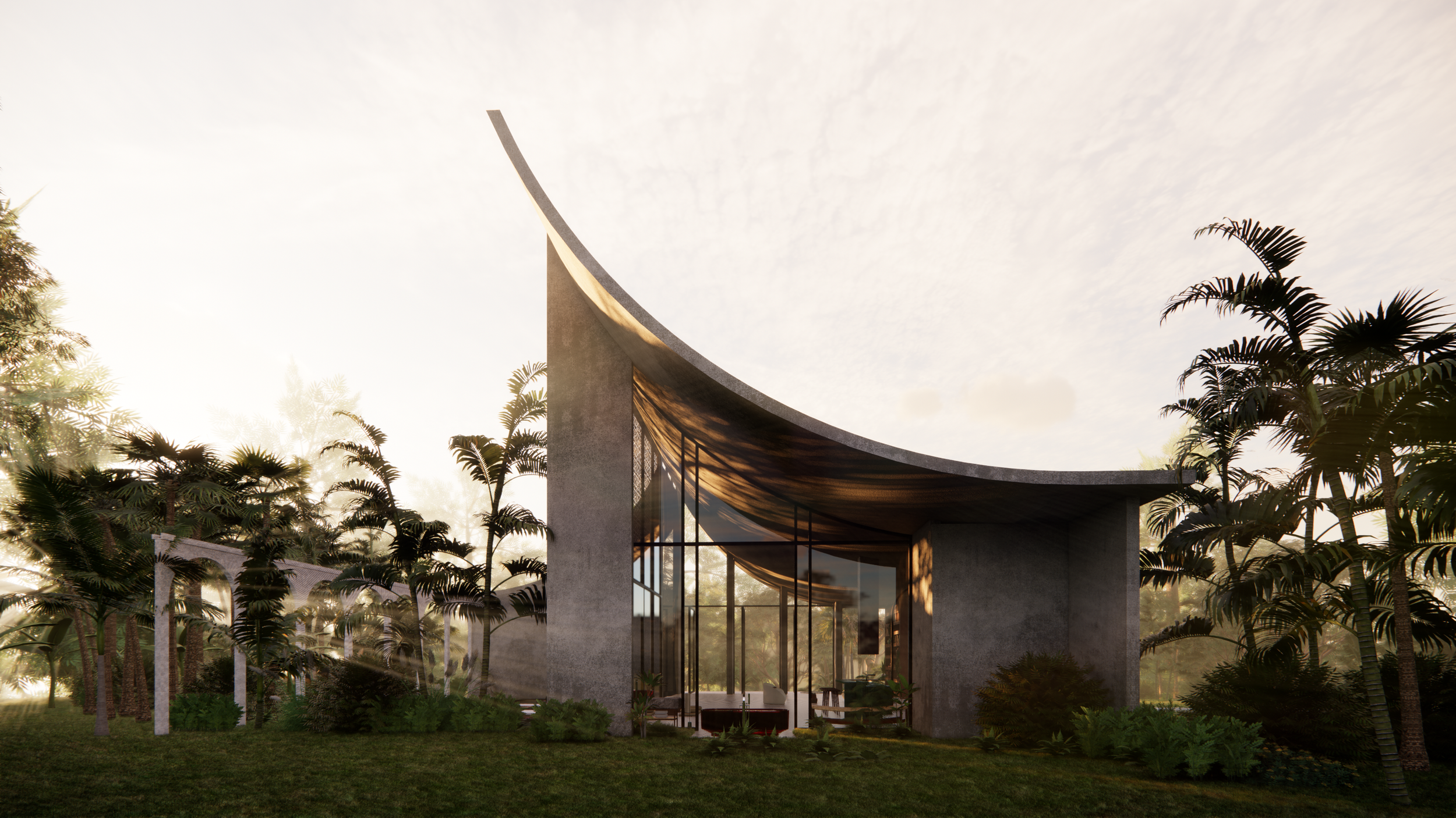 The geometry of the roof is reminiscent of curtains opening up to reveal living spaces inside. Curves help the light penetrate deeper and travel on their surface with every passing hour. Glass partitions, “carrying” the overhead structure on light, add to the floating illusion throughout the composition.